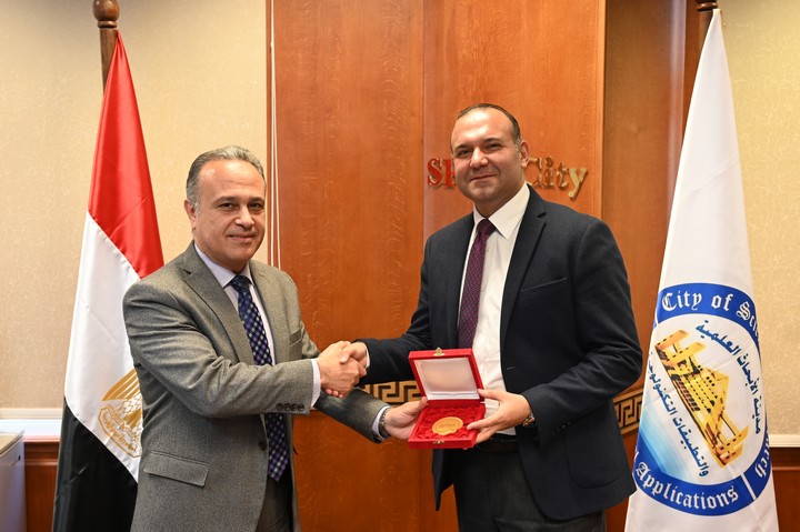 At the conclusion of the event, Professor Dr. Mohamed Rashad Abdel Fattah presented the City's Golden Medal to Counselor Dr. Moataz Ibrahim in recognition of his professional excellence, continuous contributions, and pioneering role in spreading legal culture and serving the community.